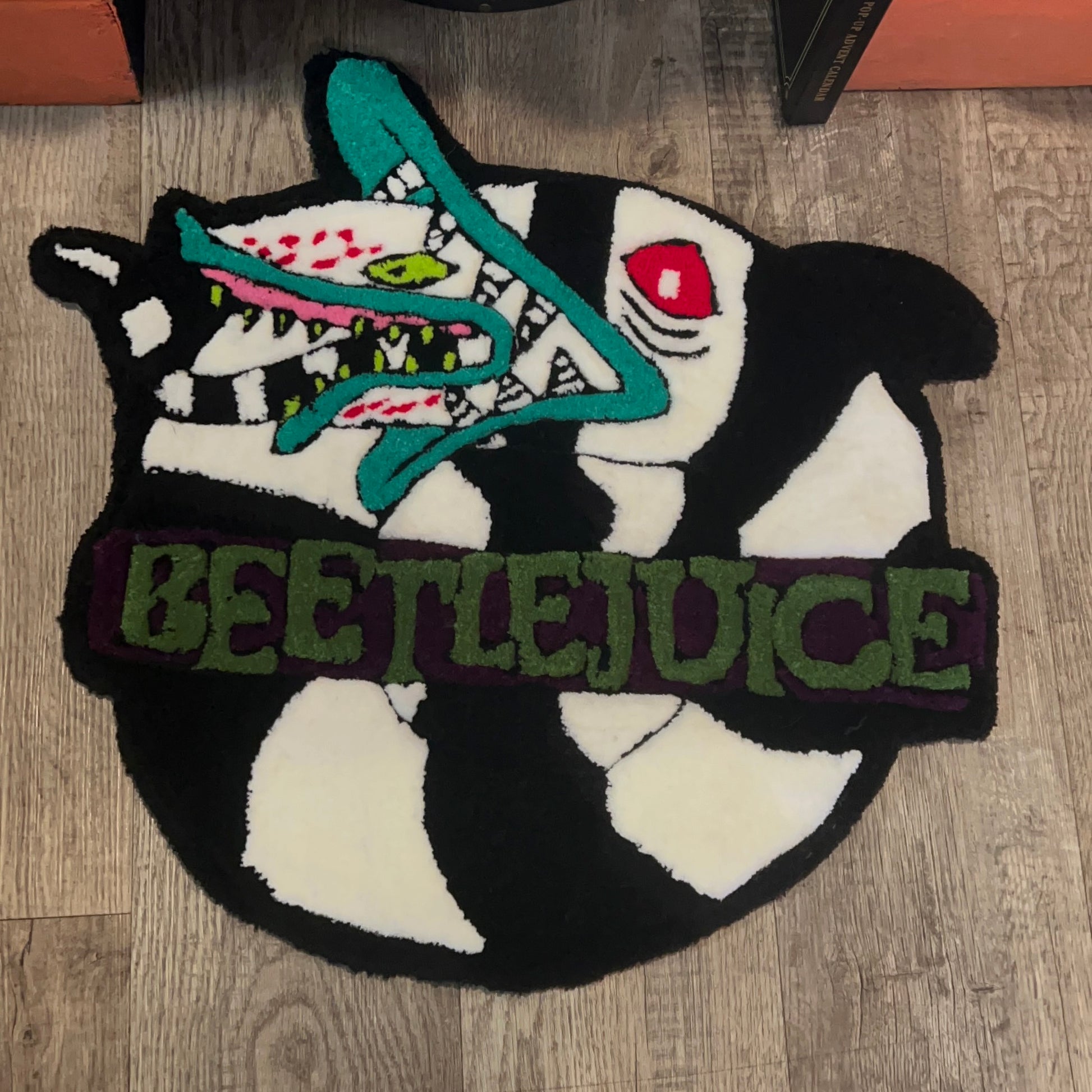Add a touch of nostalgia  to your space with this Beetlejuice Sandworm rug measuring 24" across. Handmade and tufted with various acrylic yarns. It also features a grippy grey felt backing to keep it in place.