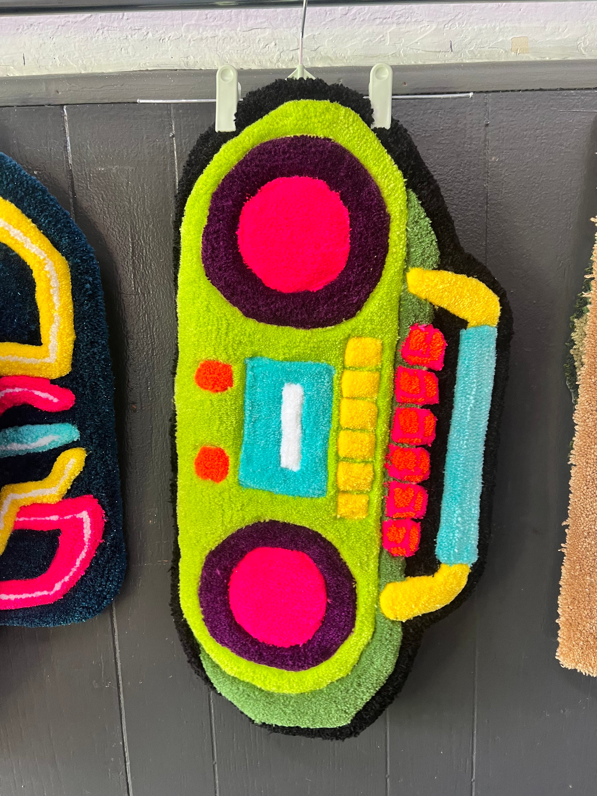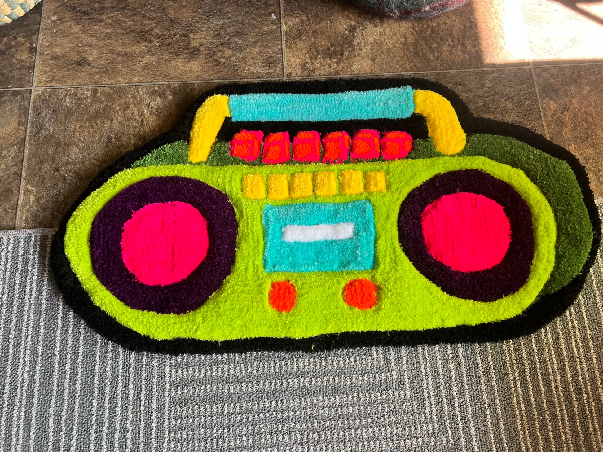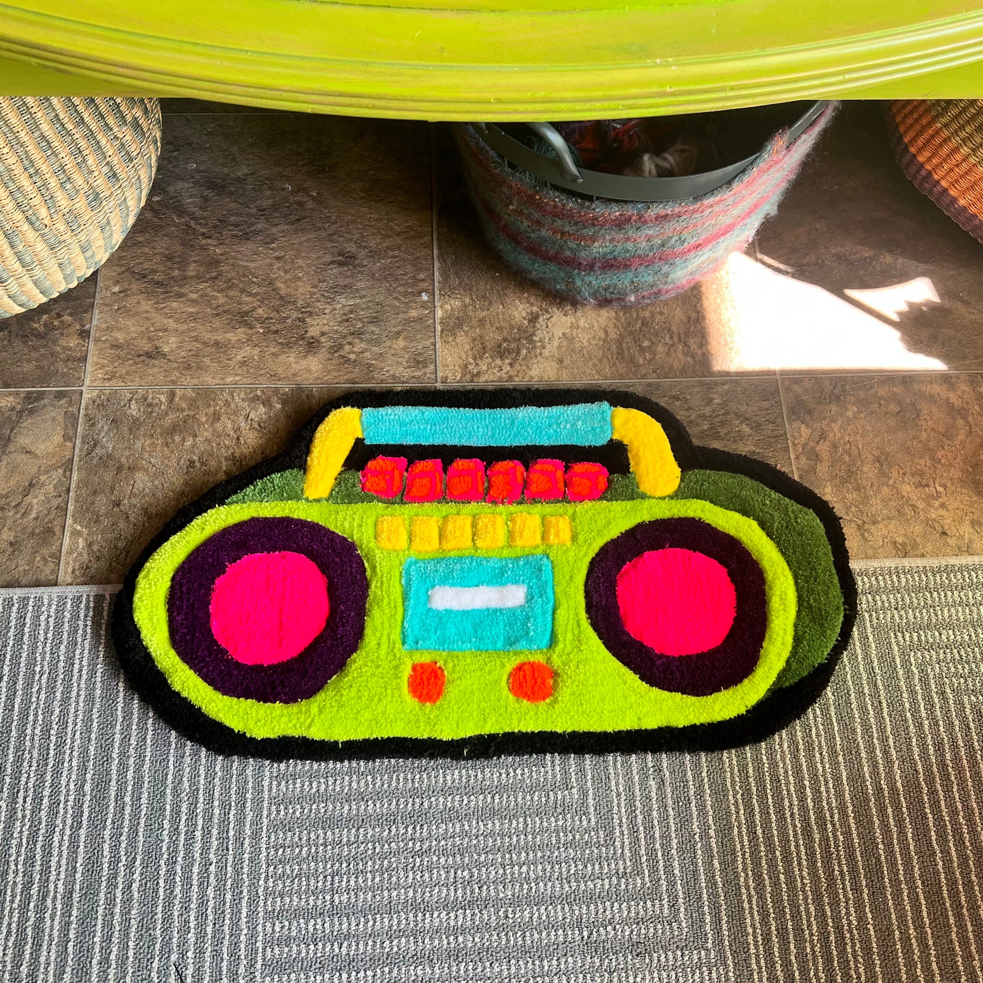 Add a pop of color to your space with this unique and quirky Boombox rug measuring 24" x 15". Handmade and tufted with various acrylic yarn. It also features a grippy grey felt backing to keep it in place.