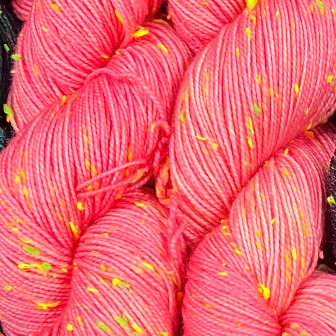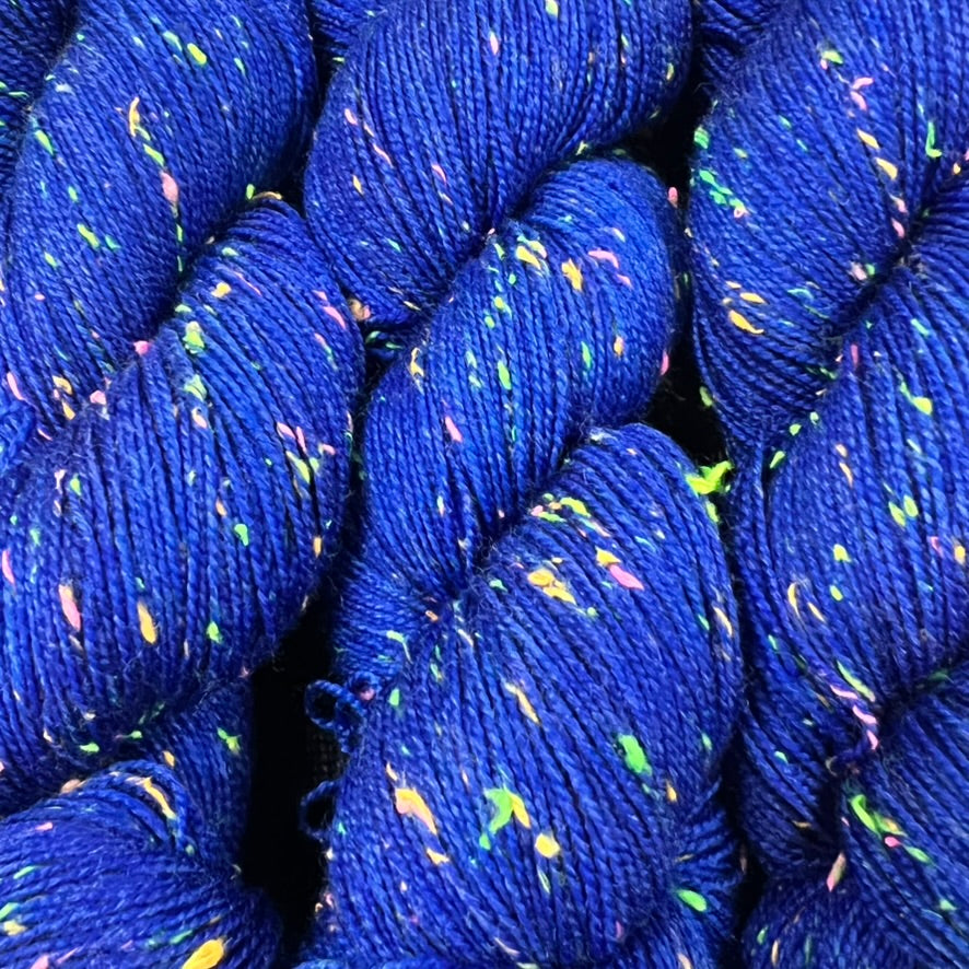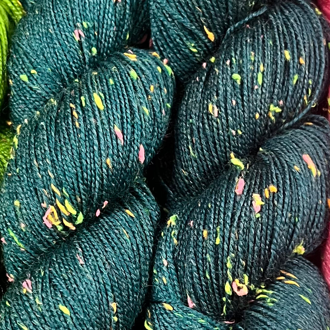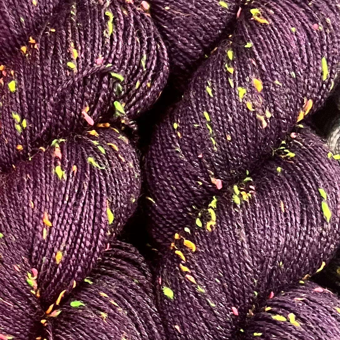 Highlight your stitches! Cathedral Falls is a fingering weight yarn with bright pops of blacklight reactive neon. The neon neps are yellow, orange, green, and pink viscose neps have been spun together to create a textured, tweed-inspired yarn. When used in a project, the yarn gives a fun vibe thanks to the speckles of neon from the quirky neps. Great for sweaters, scarves, shawls, and even pieces like socks and gloves.