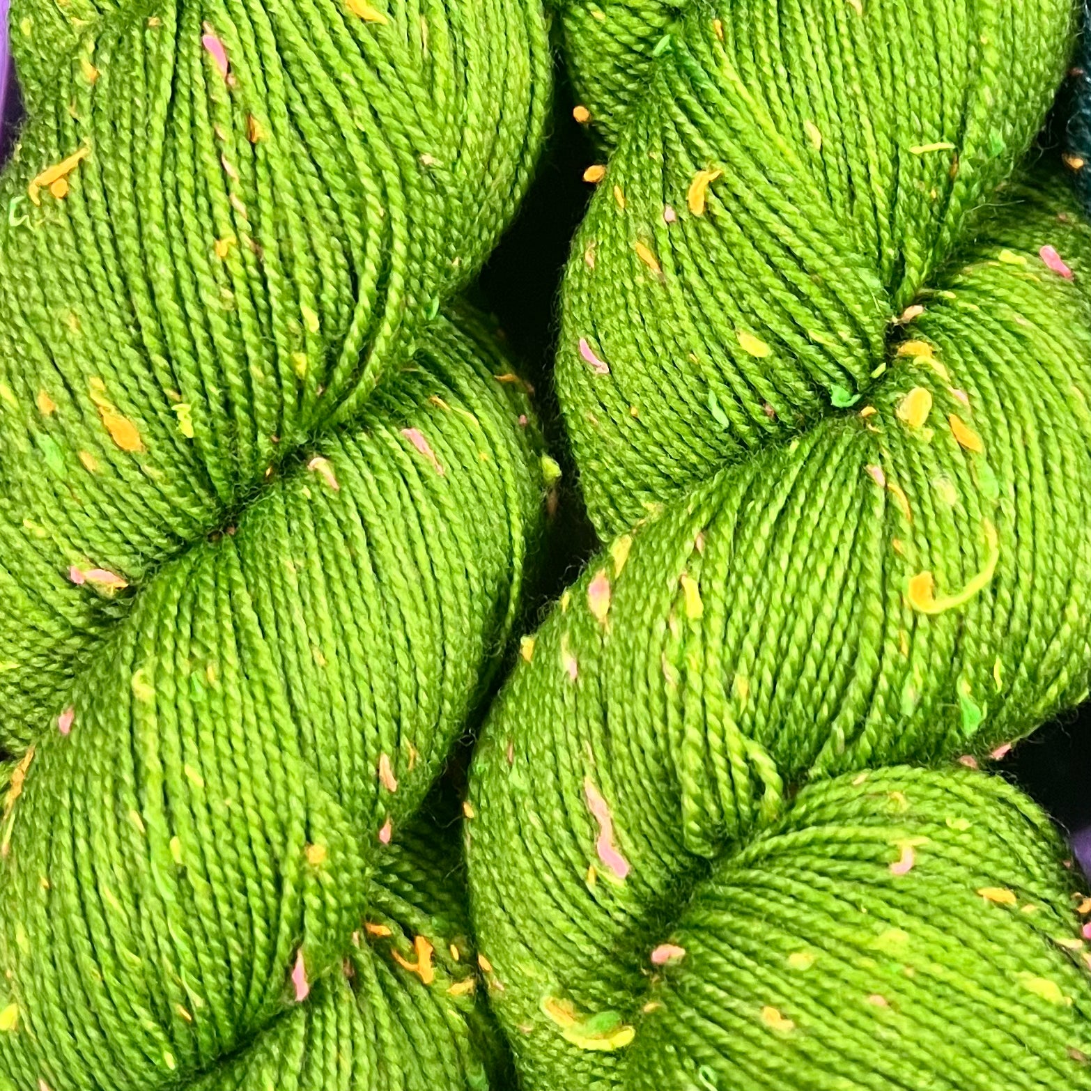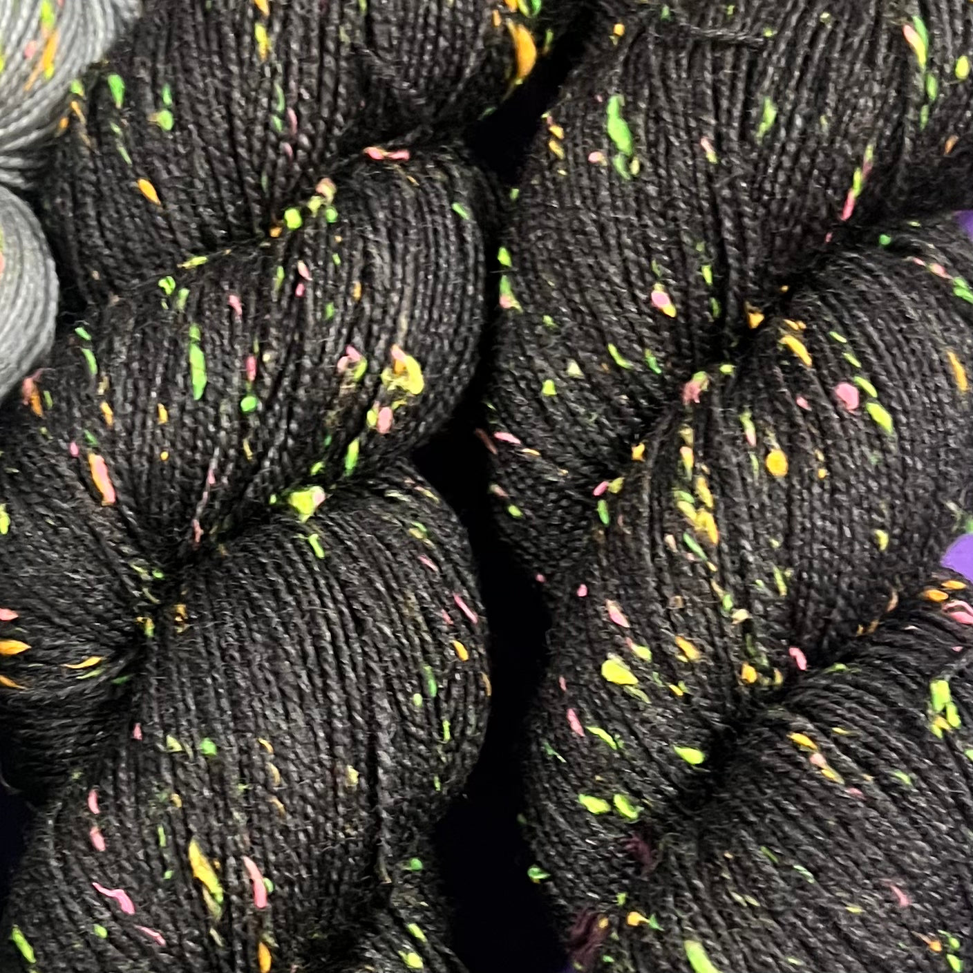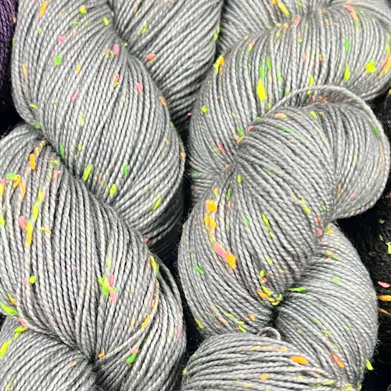 Highlight your stitches! Cathedral Falls is a fingering weight yarn with bright pops of blacklight reactive neon. The neon neps are yellow, orange, green, and pink viscose neps have been spun together to create a textured, tweed-inspired yarn. When used in a project, the yarn gives a fun vibe thanks to the speckles of neon from the quirky neps. Great for sweaters, scarves, shawls, and even pieces like socks and gloves.