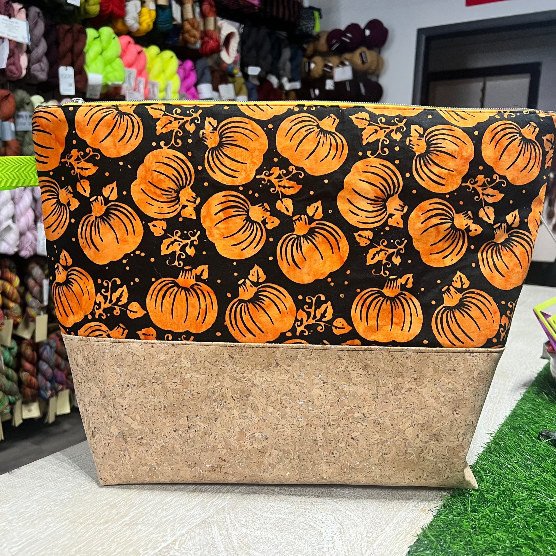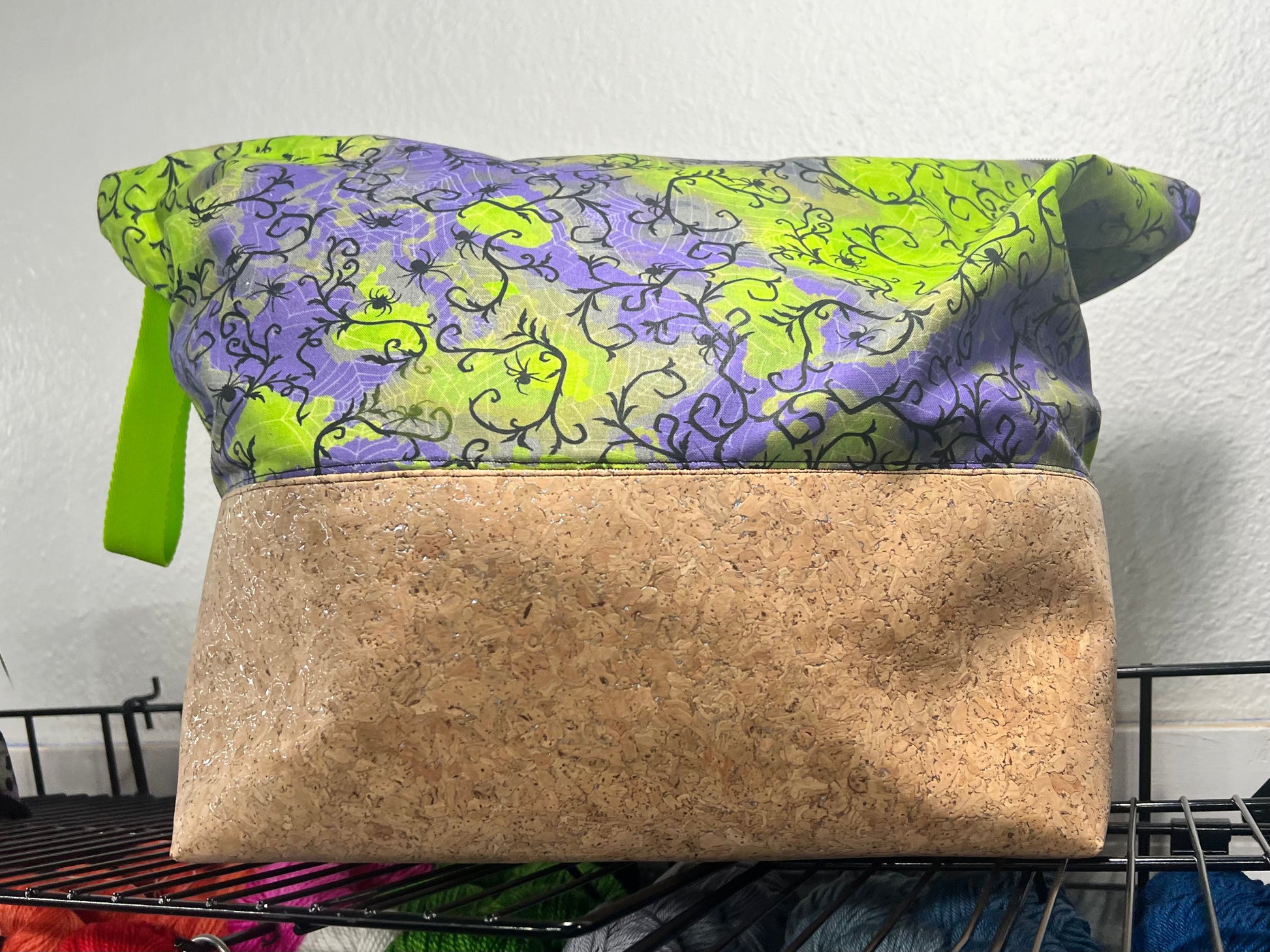 This 20" wide, 14" tall boxed cork bottom project bag, lovingly handcrafted by The Knotty Knittress herself, is perfect for your big project. Interfaced for stability, this bag can stand on its own and features a convenient zipper and handle for on-the-go crafting.