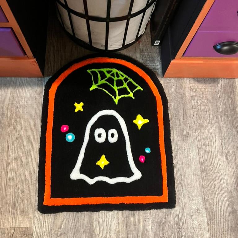 Add a touch of spooky to your space with this neon Tombstone Ghost rug measuring 19" x 24". Handmade and tufted with various acrylic yarns. It also features a grippy grey felt backing to keep it in place.