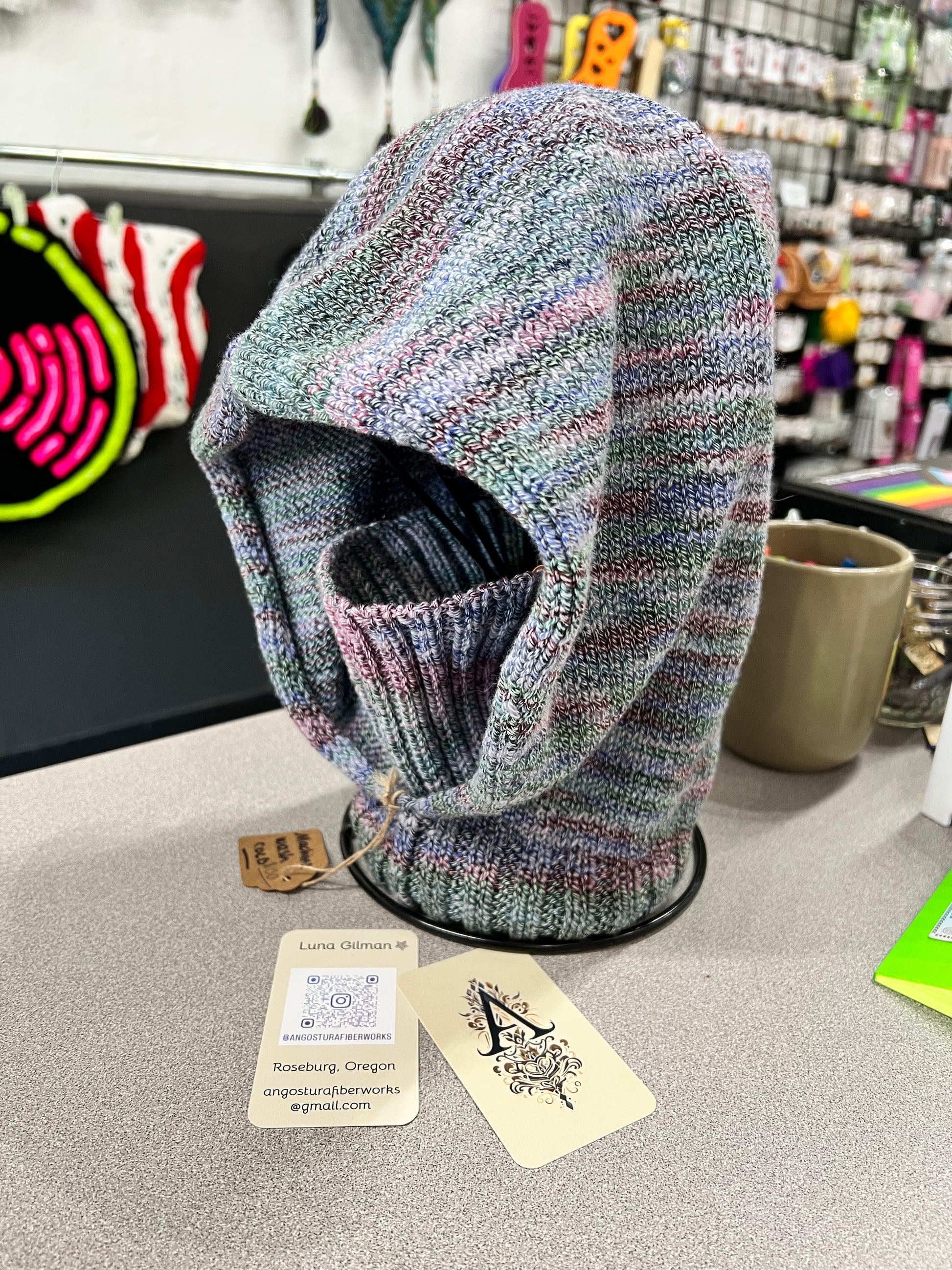 Hand knit by Luna of Angostura Fiberworks this Hoodola is cozy and warm.
