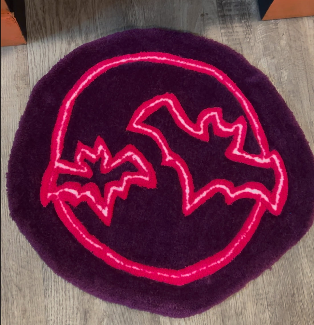 Add a touch of spooky to your space with this neon bat's rug measuring 23" x 21". Handmade and tufted with various acrylic yarns. It also features a grippy grey felt backing to keep it in place.