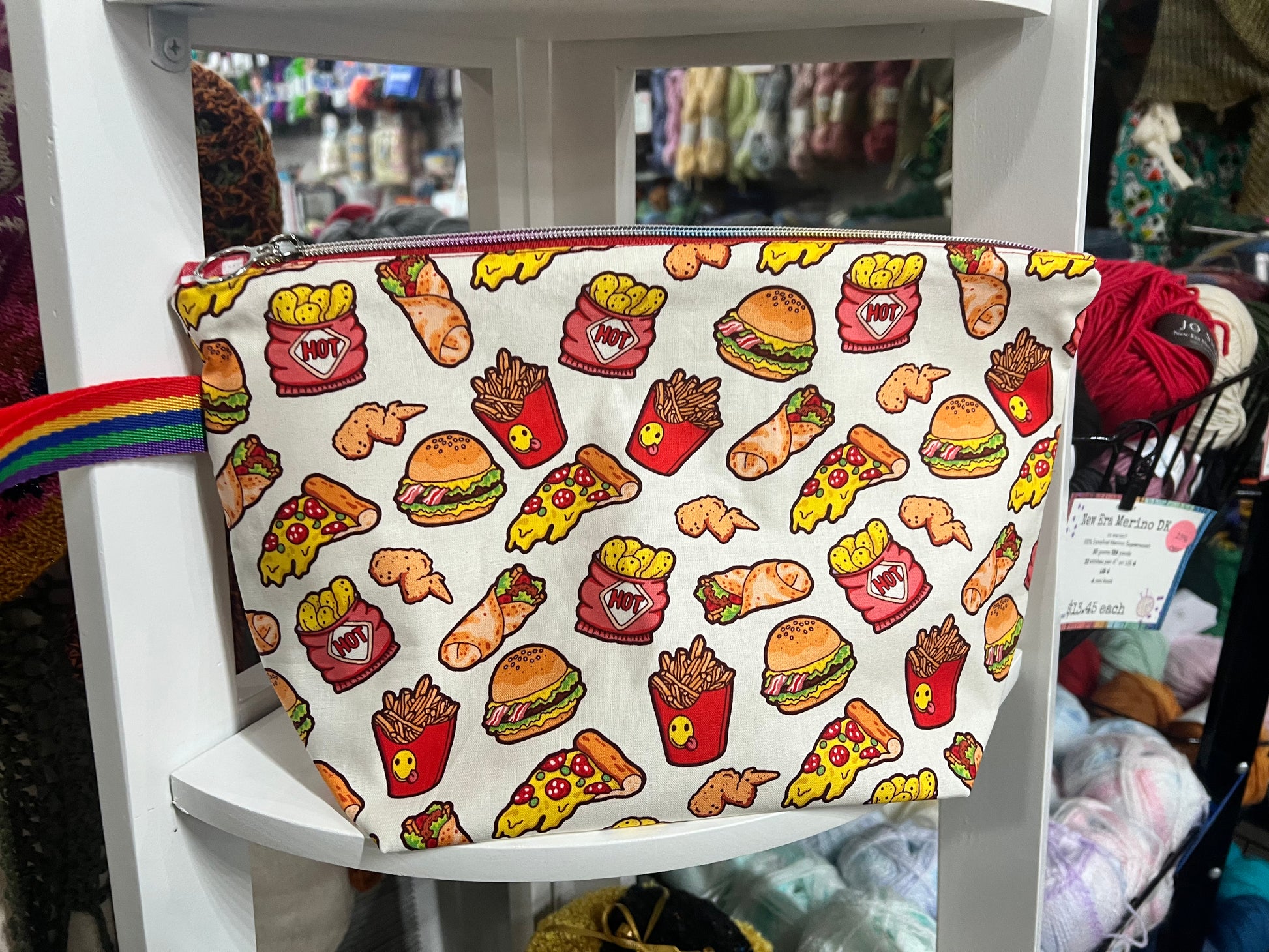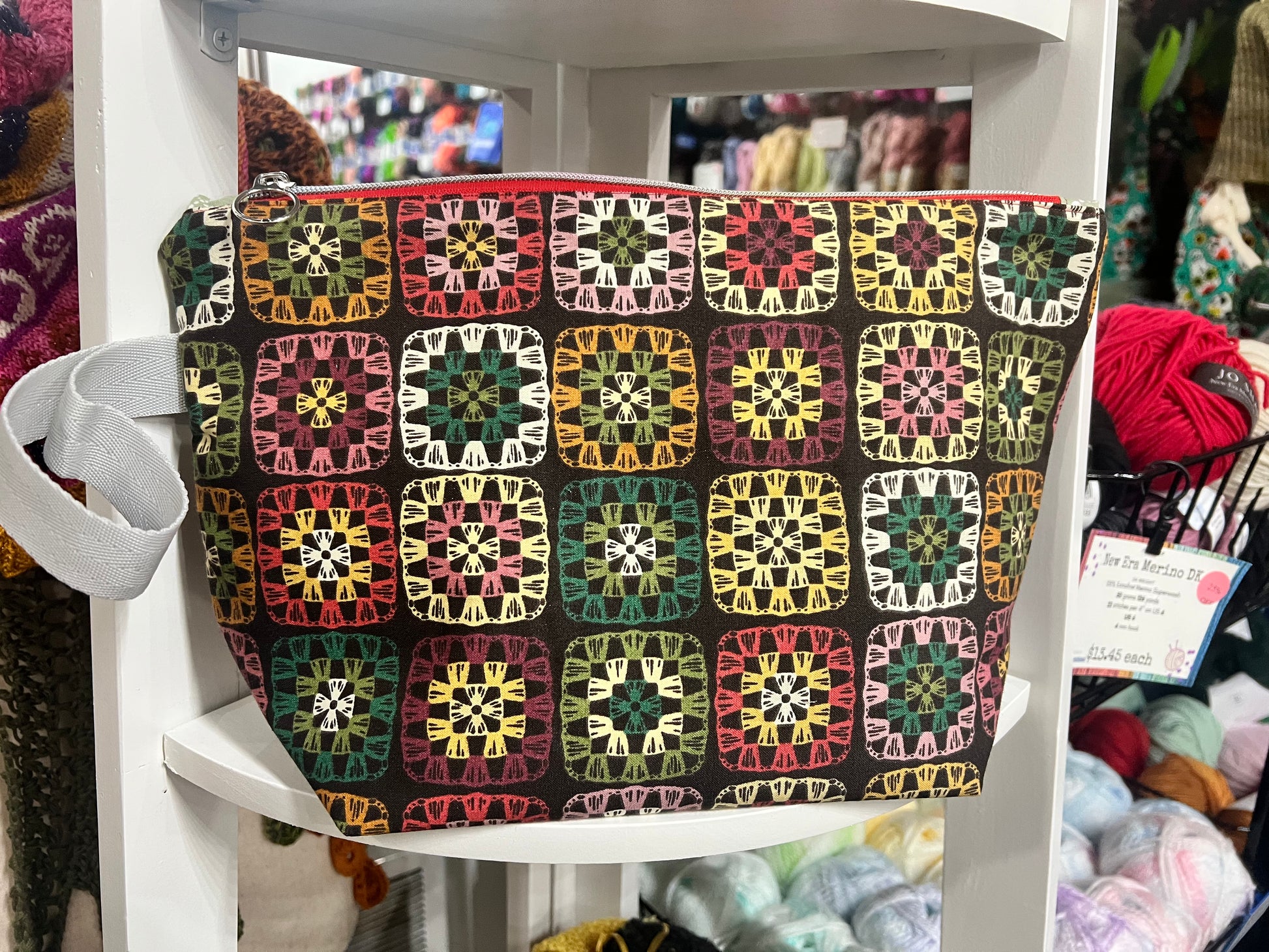 This 14" wide, 9" tall boxed bottom project bag, lovingly handcrafted by The Knotty Knittress herself, is perfect for your next project. Lightly interfaced for stability, this bag can stand on its own and features a convenient zipper and handle for on-the-go crafting.