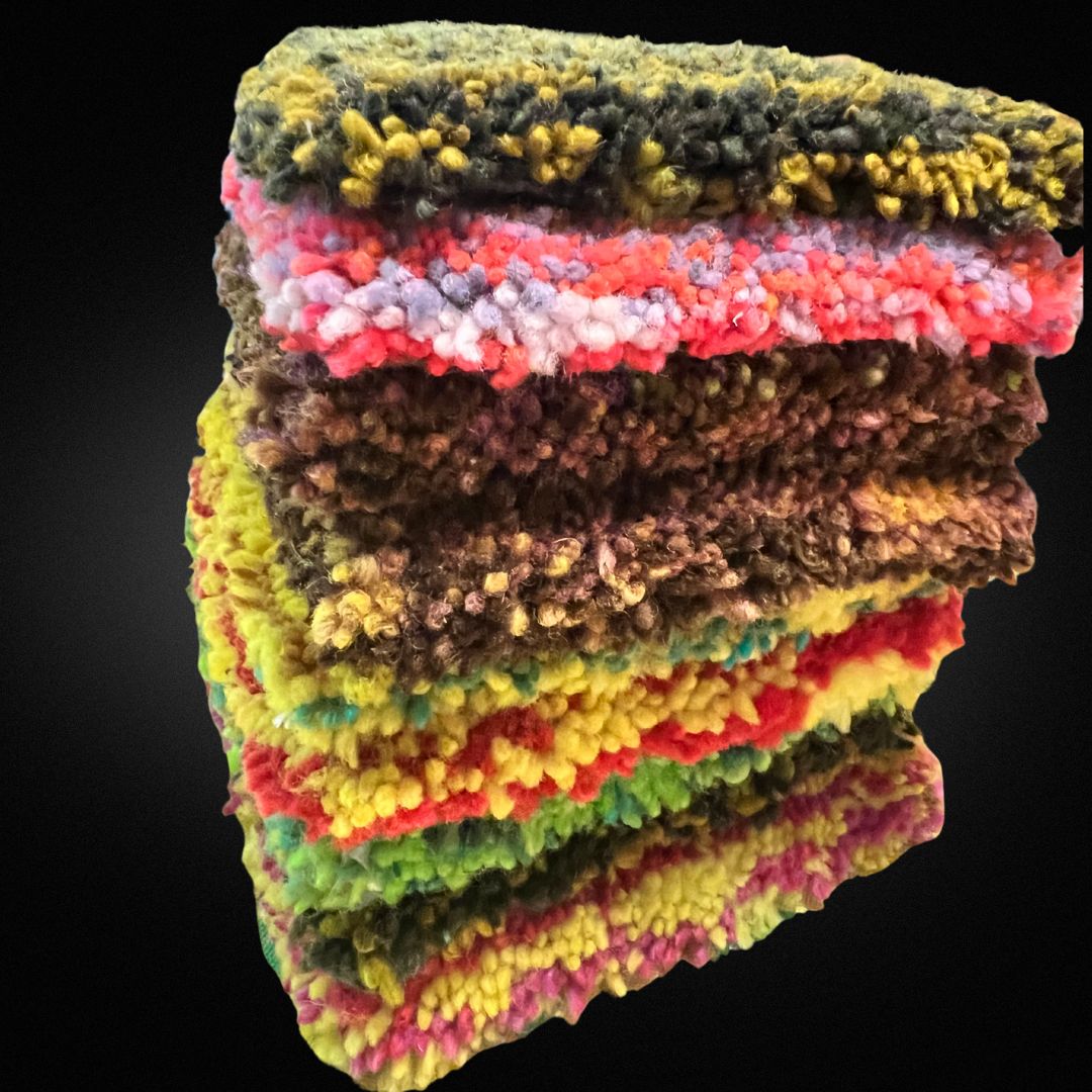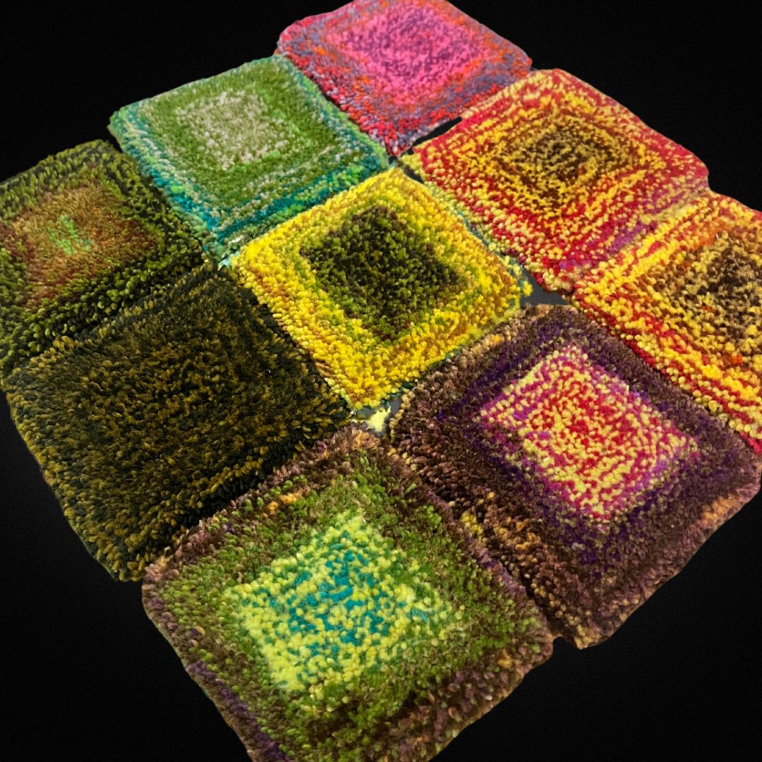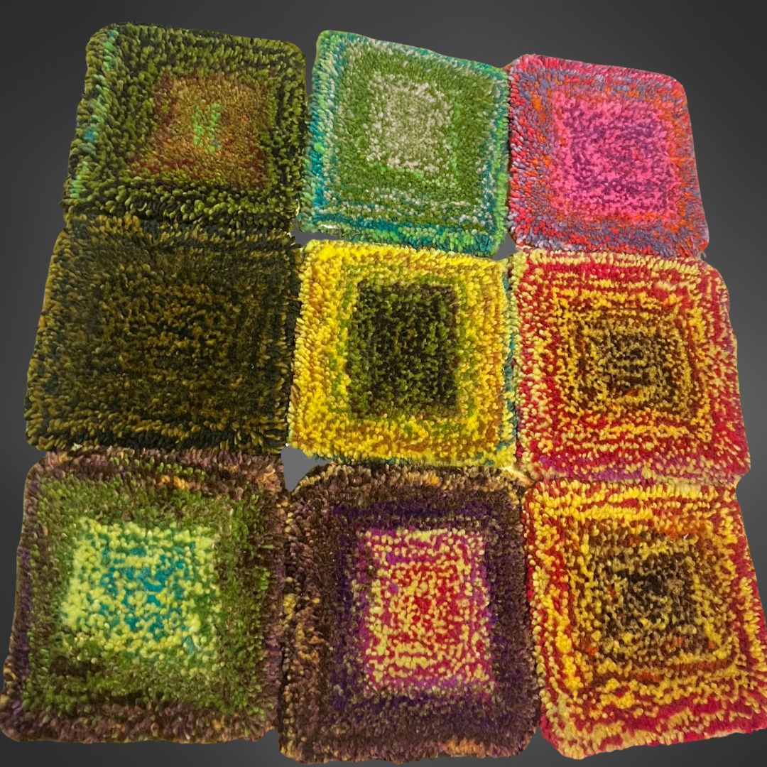 Handmade tufted with wool yarn. Mug Rug measures 5"x5". Grip grey felt backing.  assorted colors