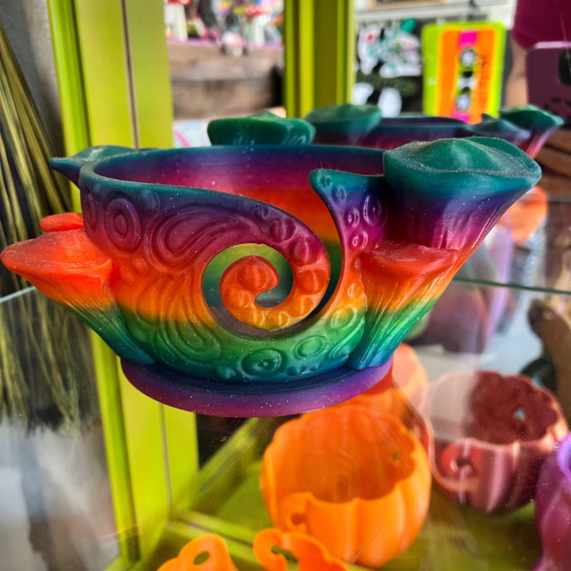These Yarn Bowls come in an array of colors. The color pattern of the rainbow can vary from bowl to bowl. These gorgeous yarn bowls are great for holding your yarn balls or cakes. No one likes a runaway ball when they're trying to crochet or knit! Every bowl is printed with high quality PLA, a biodegradable plastic. Once these are printed, time is taken to inspect each one to make sure there are no snags or sharp corners, so your yarn will stay safe.