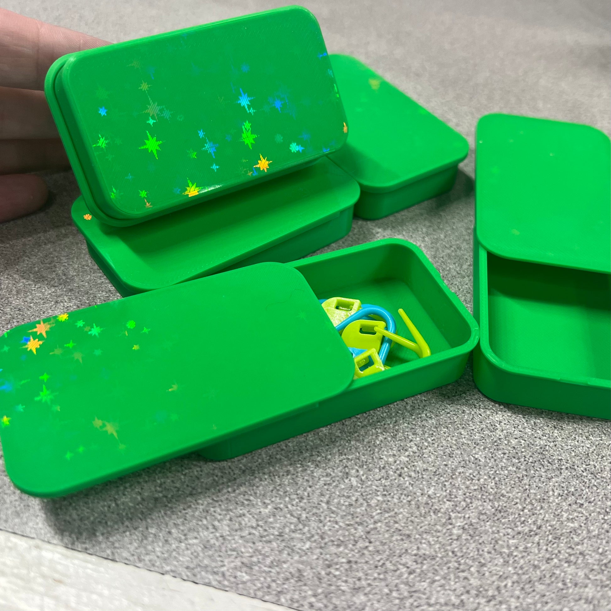 Stash your stitch markers and stoppers in this adorable notions box with slide snap lid. Then toss in your project bag for easy findings at your fingertips. 3" long 1.75" wide .5" deep