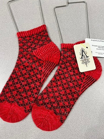 Hand knit by Luna of Angostura Fiberworks these Rhubarb and Custard socks are cozy and warm. Womens Size 8