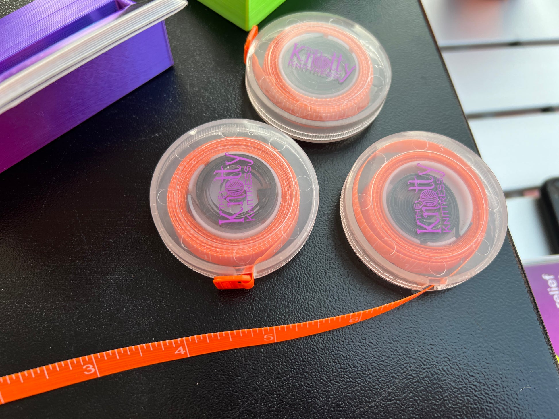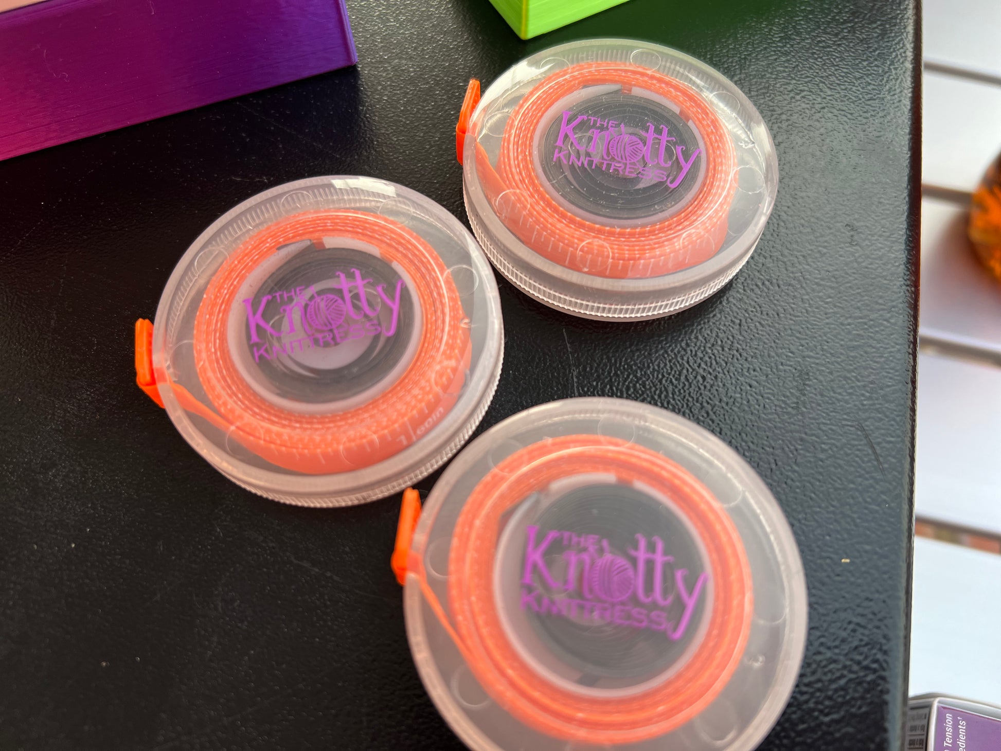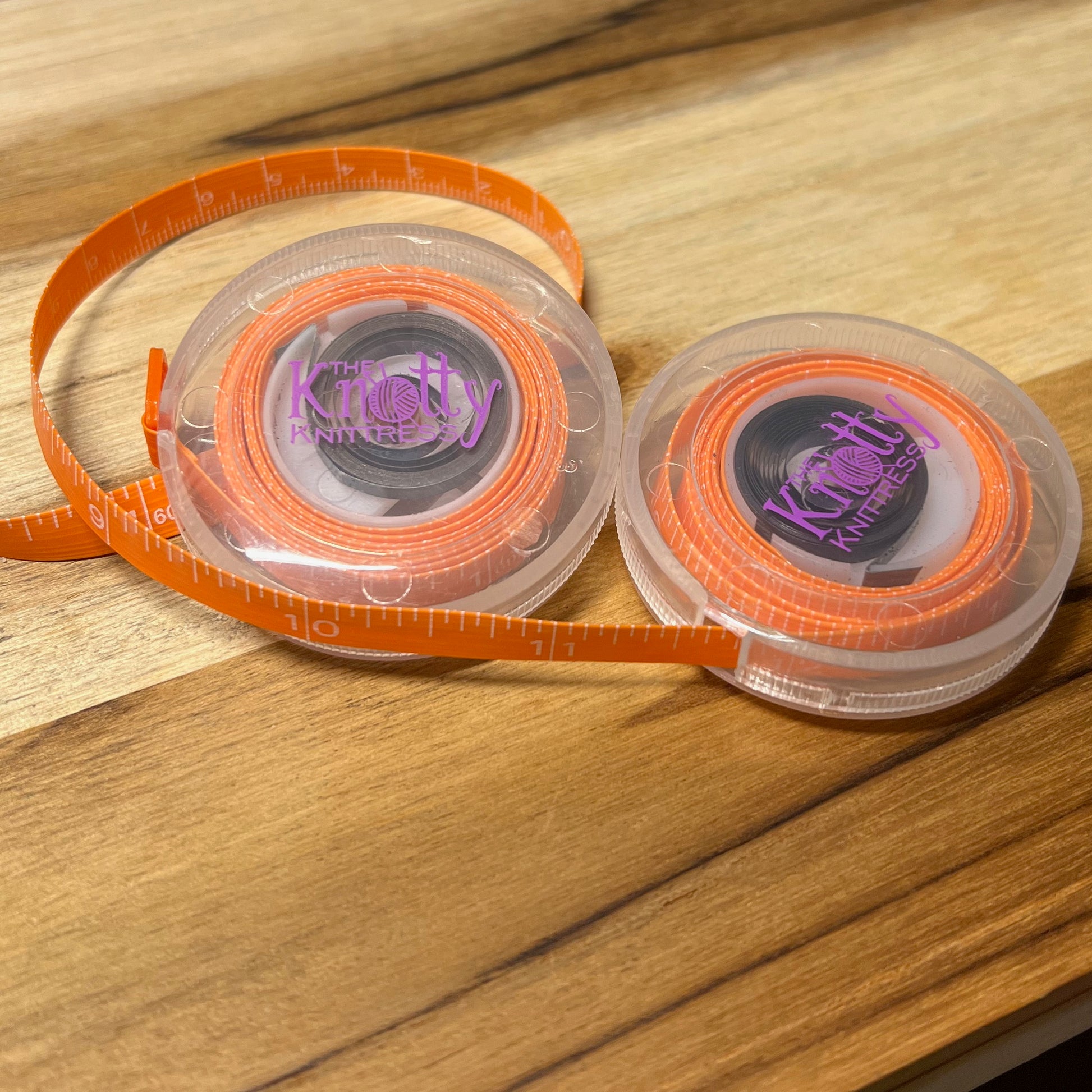Orange tape with white numbers in a clear case featuring The Knotty Knittress logo.