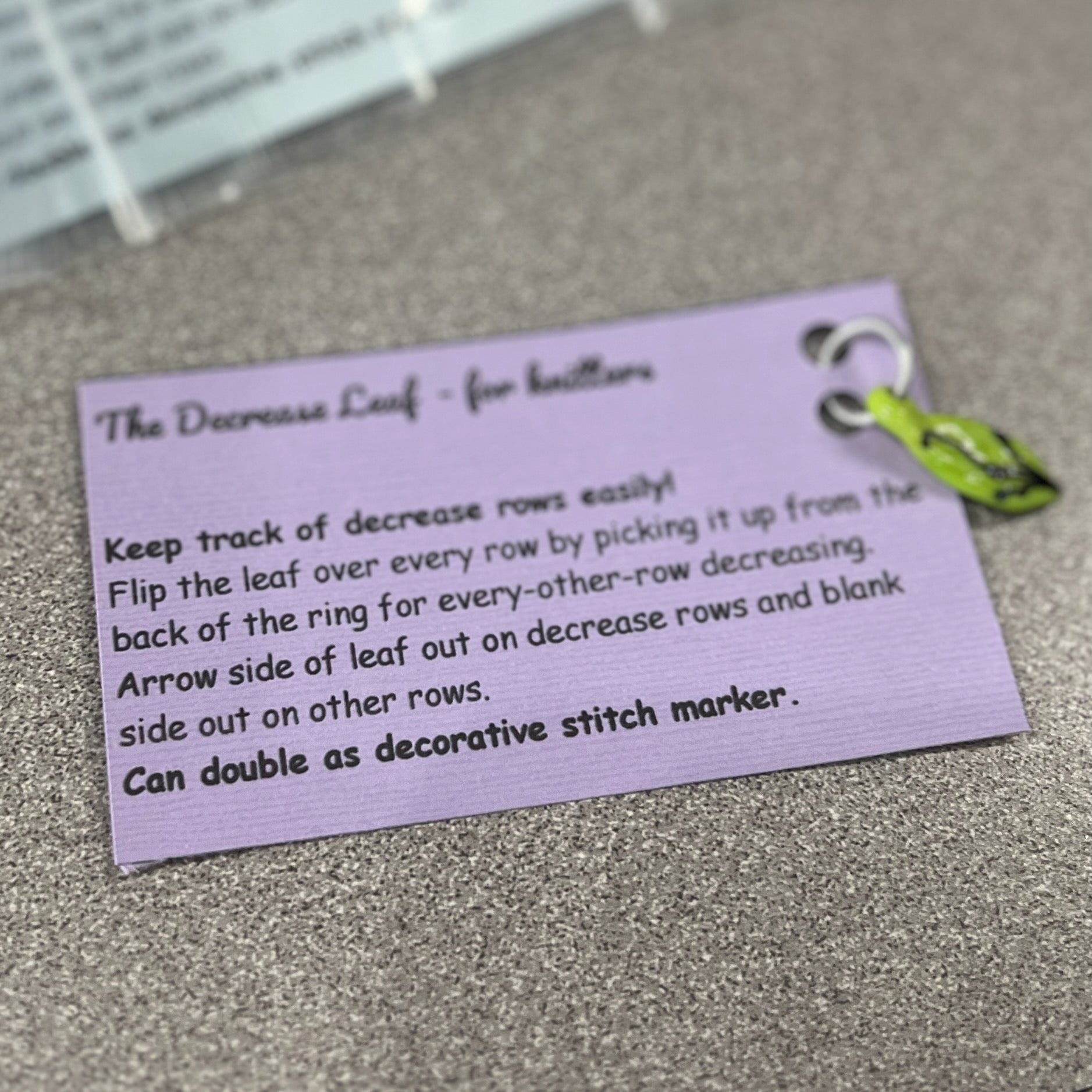Keep Track of Decrease rows easily! Flip the Leaf over every row by picking it up from the back of the ring for every-other-row decreasing. Arrow side of the leaf out on decrease rows and blank side out on other rows.