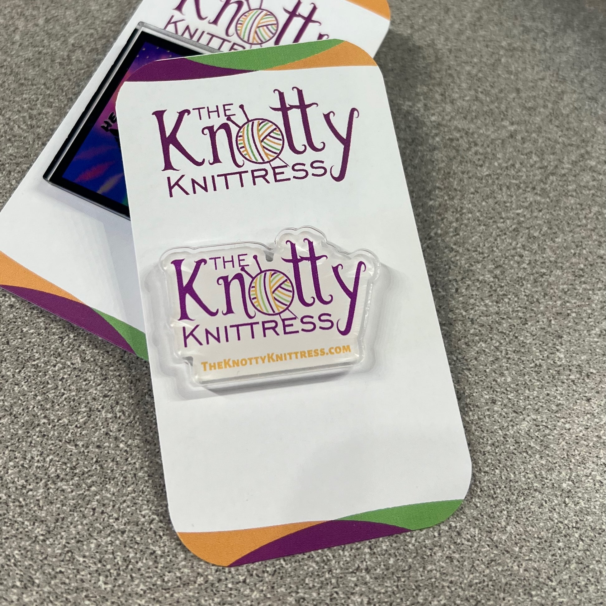 Let your love for The Knotty Knittress shine with this 1.5" acrylic pin featuring a rubber back. Pin it onto your go-to project bag, a pin tabard, or your trusty jean jacket. The options are only limited by your imagination!