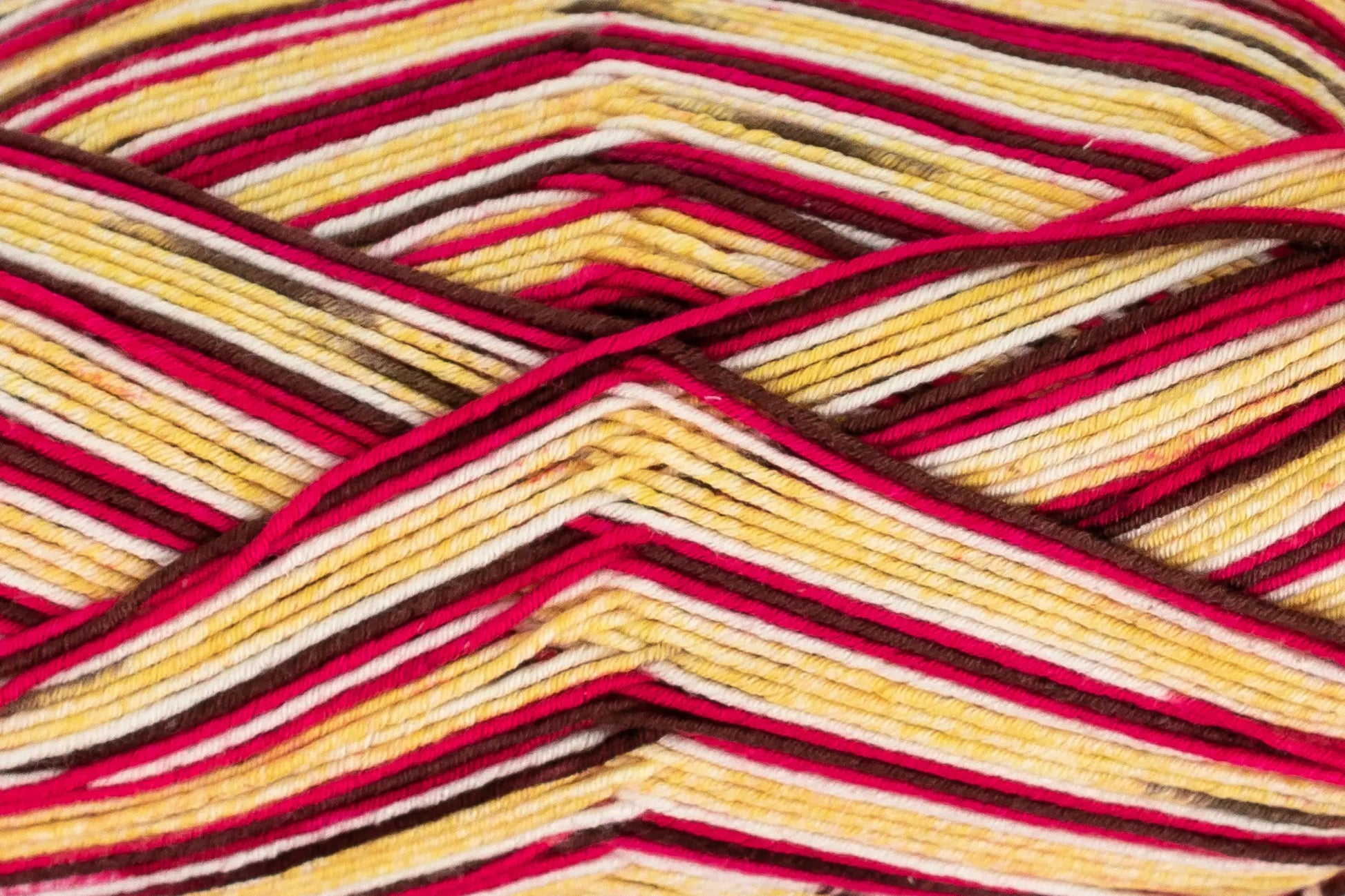 Footsie 4ply is a gorgeous variegated acrylic yarn with added PBT to give strength and structure and also for added wear of socks. Footsie colours are titled after six sumptuous fruits and the variegation perfectly characterises this. Ideal for those who are allergic to wool but also want to wear fun and fruity socks!