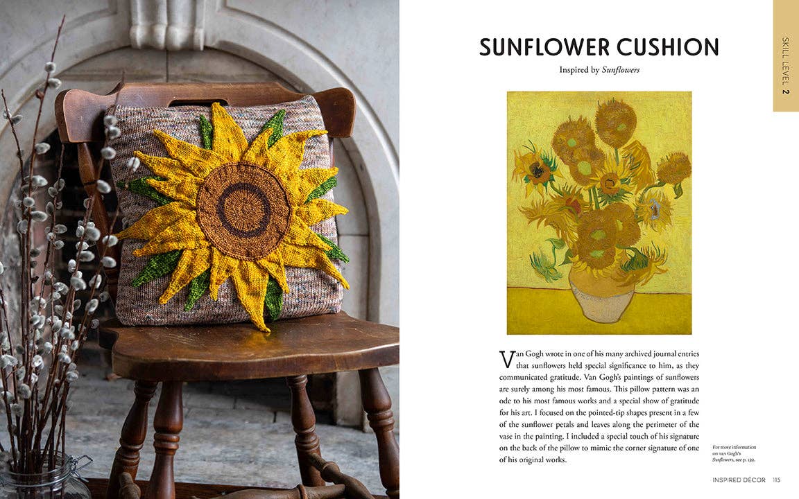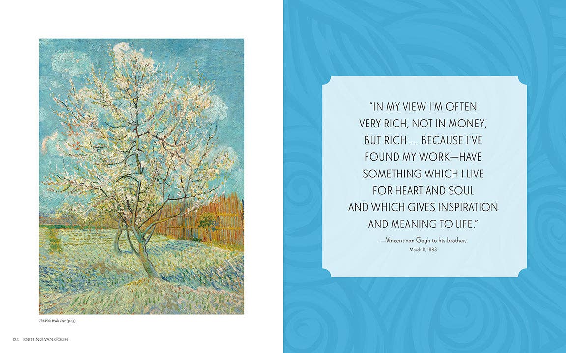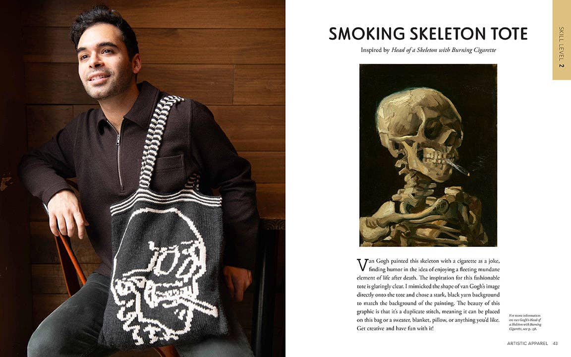Published in collaboration with the Van Gogh Museum, Knitting Van Gogh celebrates the artist’s life and legacy by interpreting his paintings into beautifully knit pieces. From van Gogh’s almond blossoms and wheat fields to his stunning self-portraits and still lifes featuring Irises and Sunflowers, van Gogh’s most famous themes are the inspiration for these exquisite knit pieces. Knitting van Gogh features a wide variety of patterns for knitters of every skill level, from a vase cozy inspired by van Gogh’s Sunflowers and a cap inspired by his famous An Old Woman from Arles, to a lacey shawl invoking his Almond Blossom, a scarf inspired by his swirling nighttime backgrounds, and a tote emblazoned with his famous Head of a Skeleton with a Burning Cigarette.