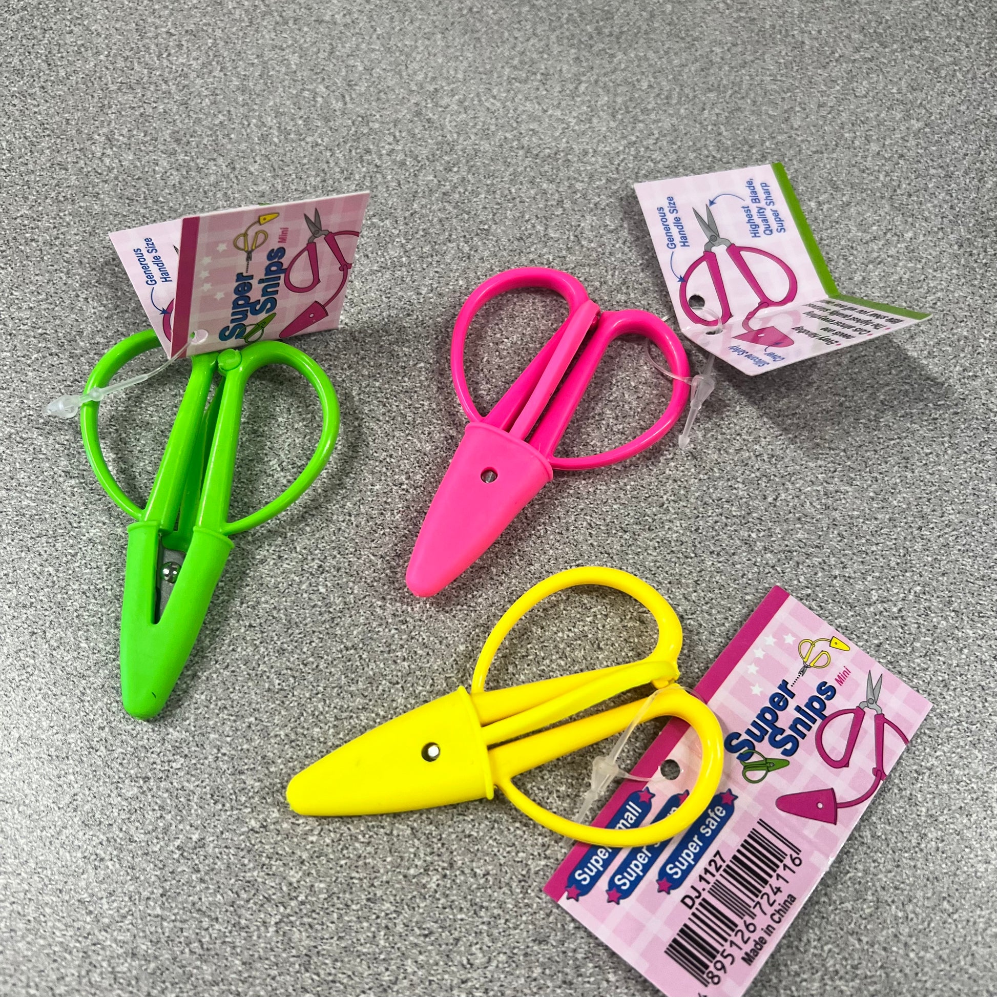 Assorted brightly colored scissors with attached Silicone safety cover.