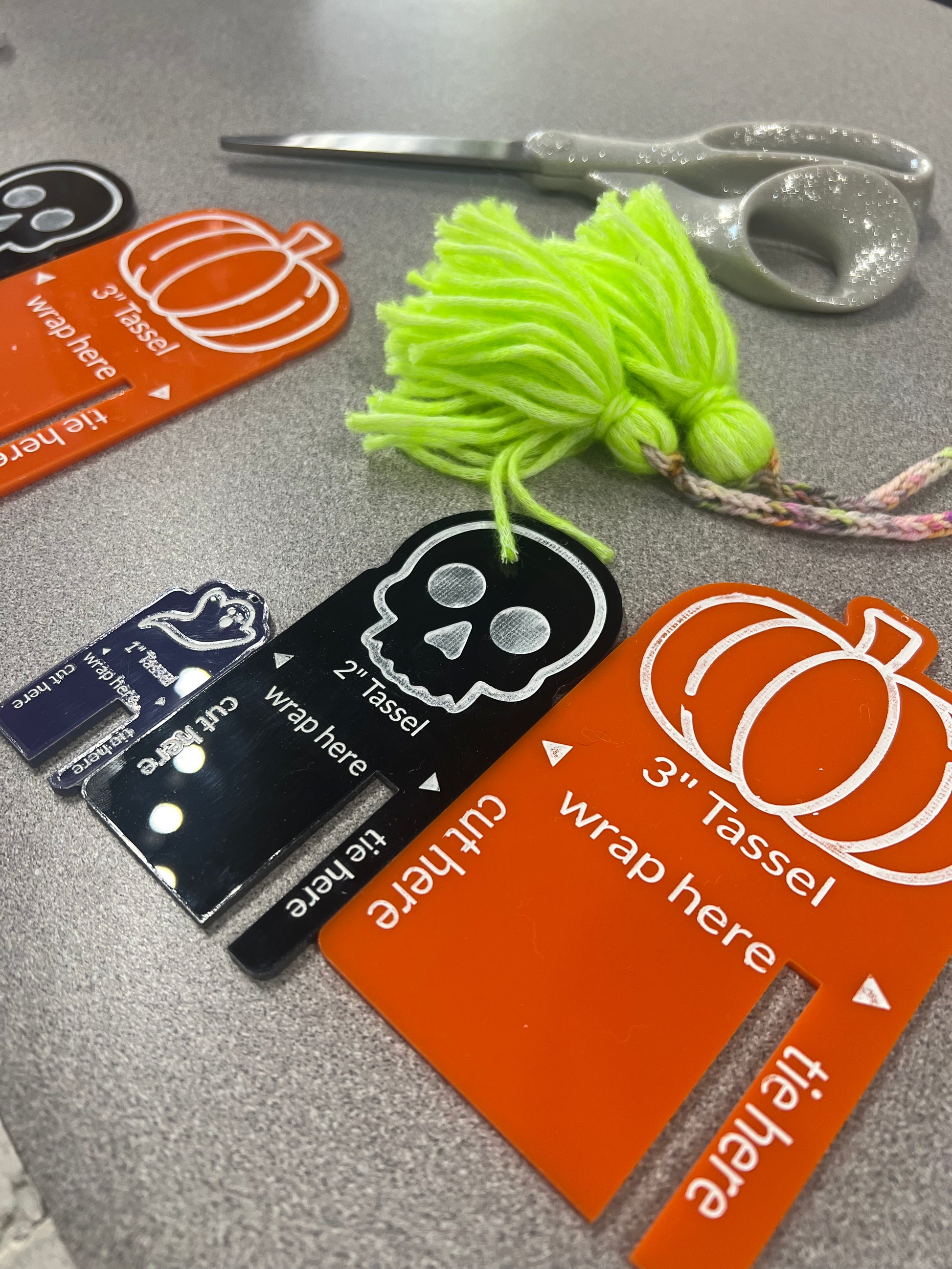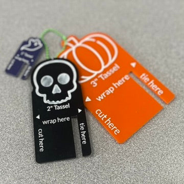 From shawls to keychains Tassels are a great way to adorn you latest work and use up scrap yarn. This tassel maker set comes with 3 sixes and a fun halloween theme. 3", 2", and 1". Keep them together and attach to you notions bag with the included ball keychain .