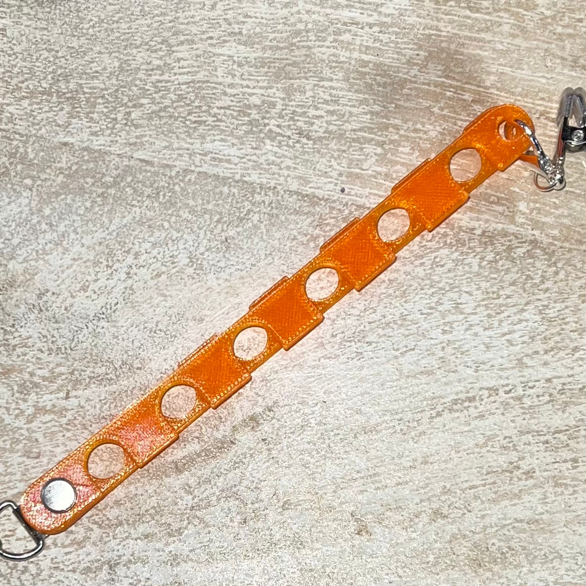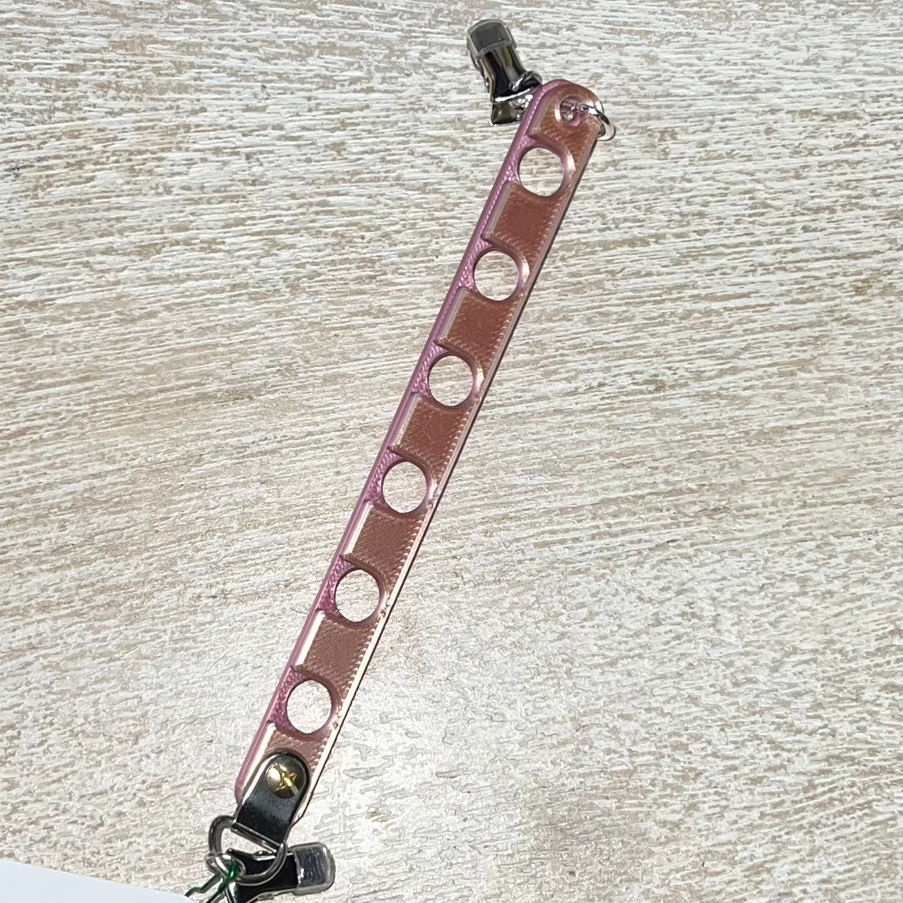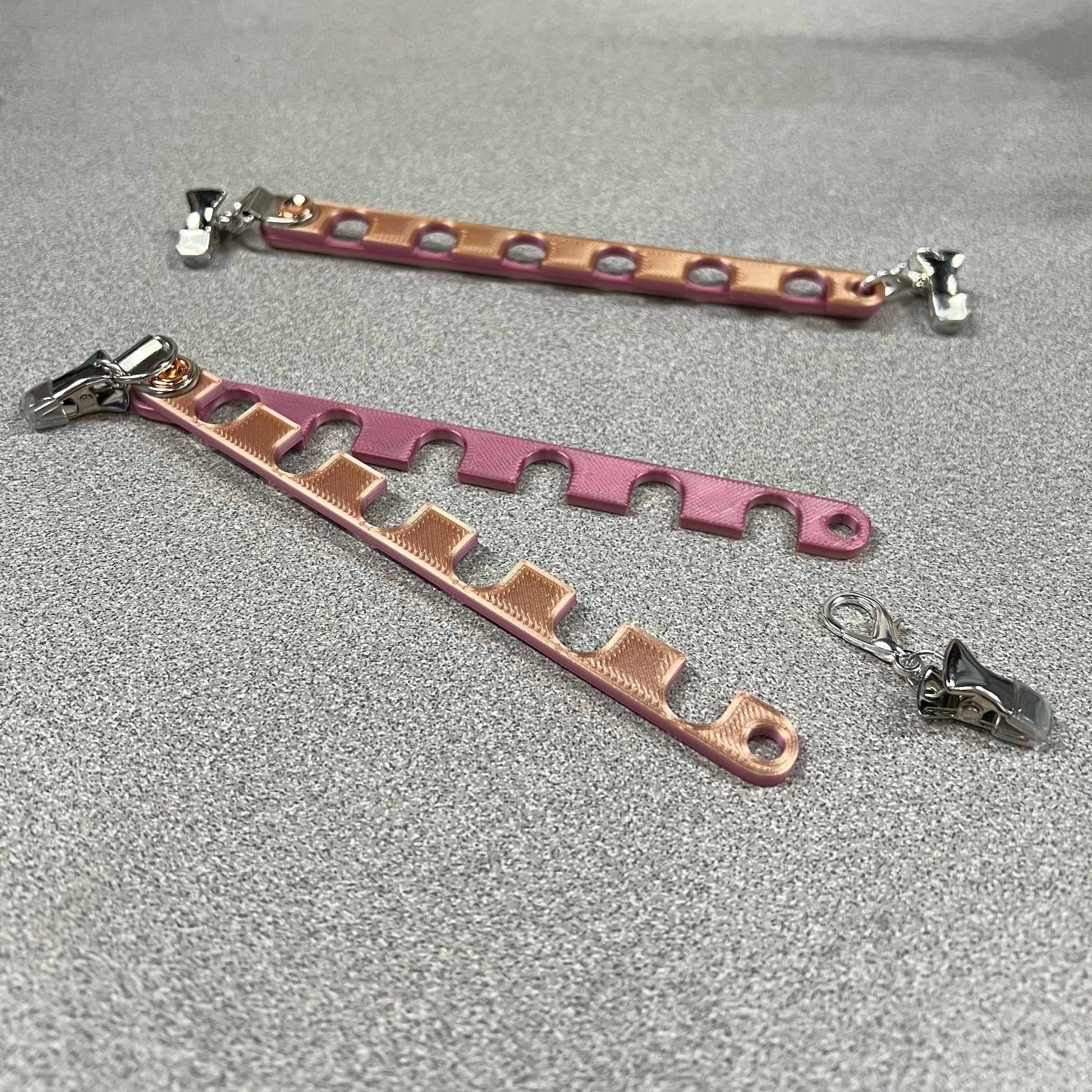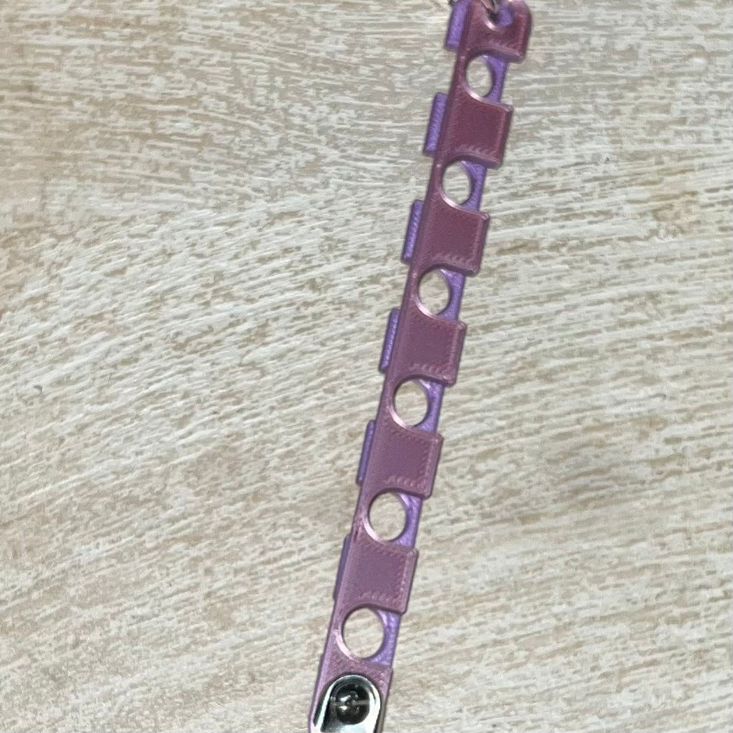 Make colorwork projects a little easier with this yarn guide. Clip to your project bag and place yarn in one of the six openings for tangle free colorwork. Easily clips to your project bag. Lobster clasp on one end allows you to open the slots for easy yarn insertion/removal.